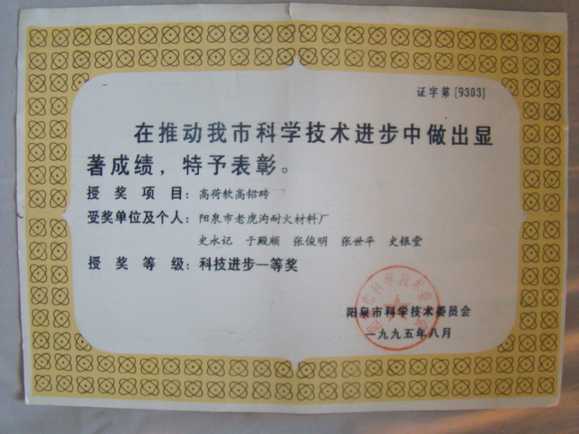 熱風(fēng)爐用低蠕變高鋁磚、高荷軟高鋁磚獲省科技進步二等獎,微膨脹高鋁磚列入火炬計劃項目,炭素焙燒爐用特種高鋁磚已批準(zhǔn)國家專利